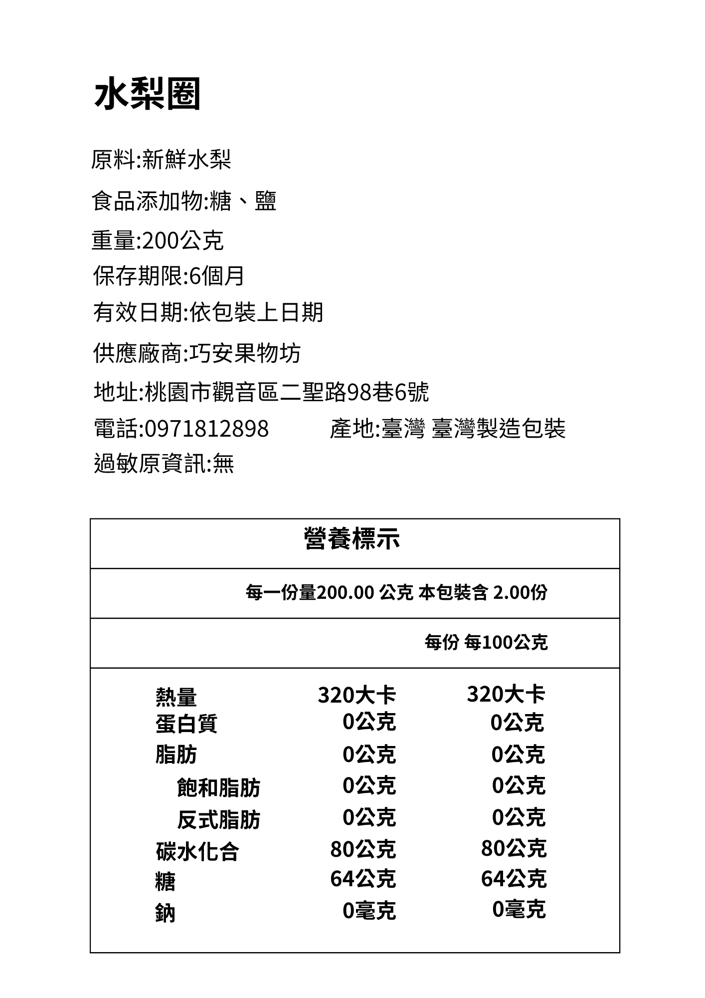 台灣水梨圈,來自大自然的清甜,運用台灣在地嚴選高山水梨,均勻切片並透過低溫烘烤脫去水分,將水梨的清甜與多汁封存其中,口感爽脆不黏牙,吃得到水梨的自然原味。